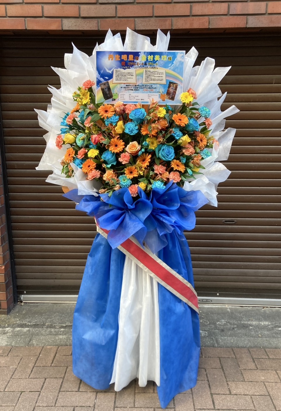 日向坂46リアルミーグリに贈られた、青やオレンジ、黄色の花が鮮やかなフラワースタンド。祝福パネルも華やかで、元気いっぱいの雰囲気を演出しています。