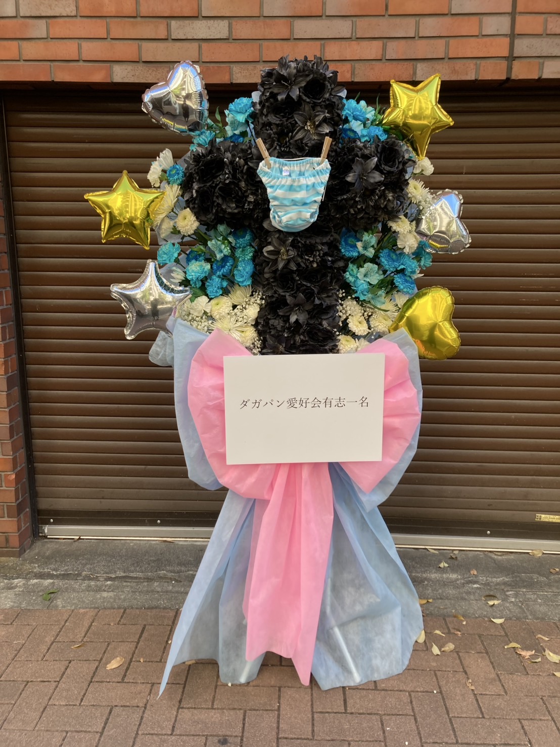 黒と青を基調に、ピンクのリボンがアクセントのフラスタ。星やハートのバルーン、個性的な装飾が目を引くファンイベント向けデザイン。