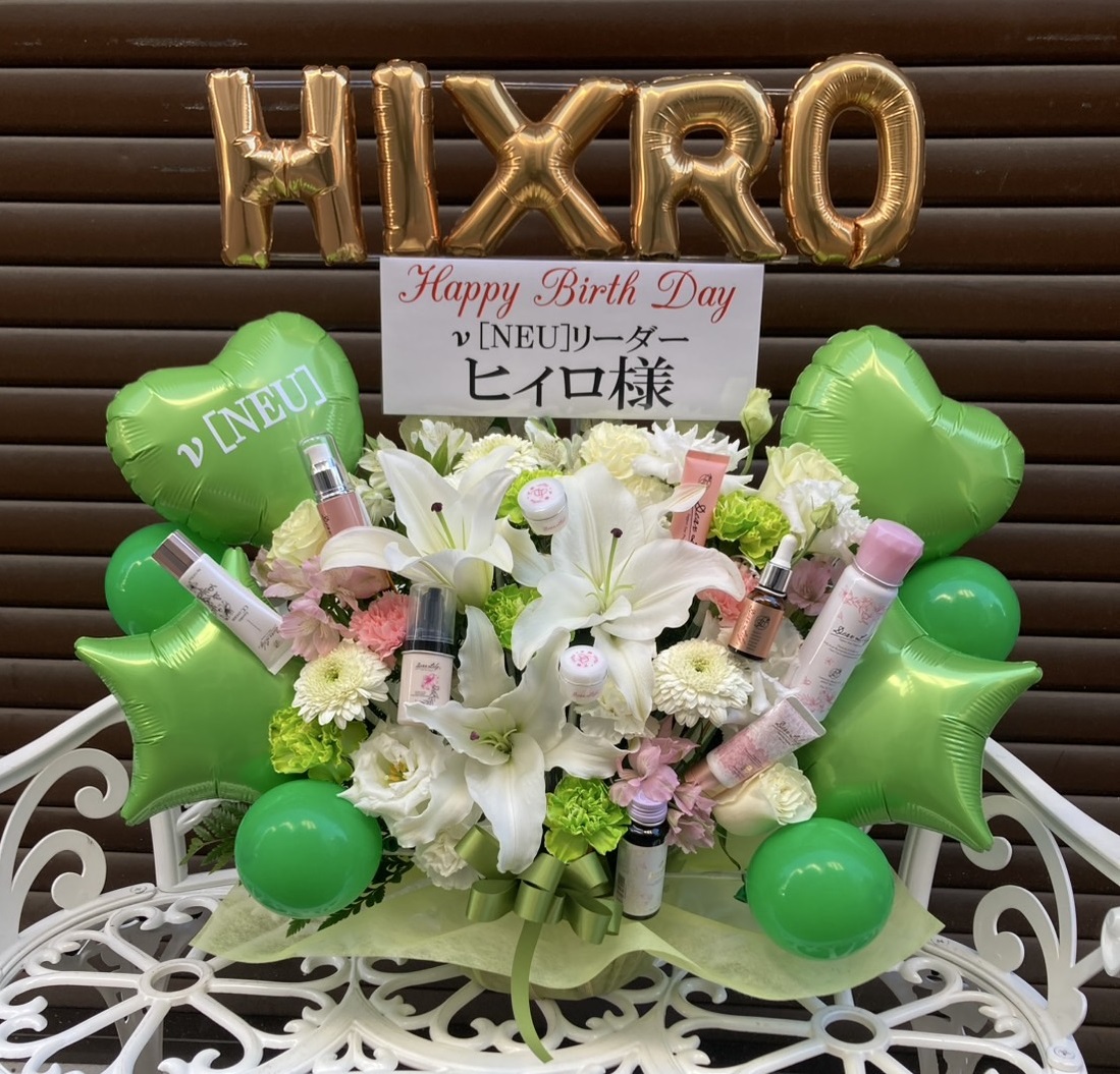 爽やかな緑と純粋な白を基調とした、可愛らしい誕生日フラスタ。ハートや星のバルーンと生花が、ヒイロ様の特別な日を華やかに彩ります。