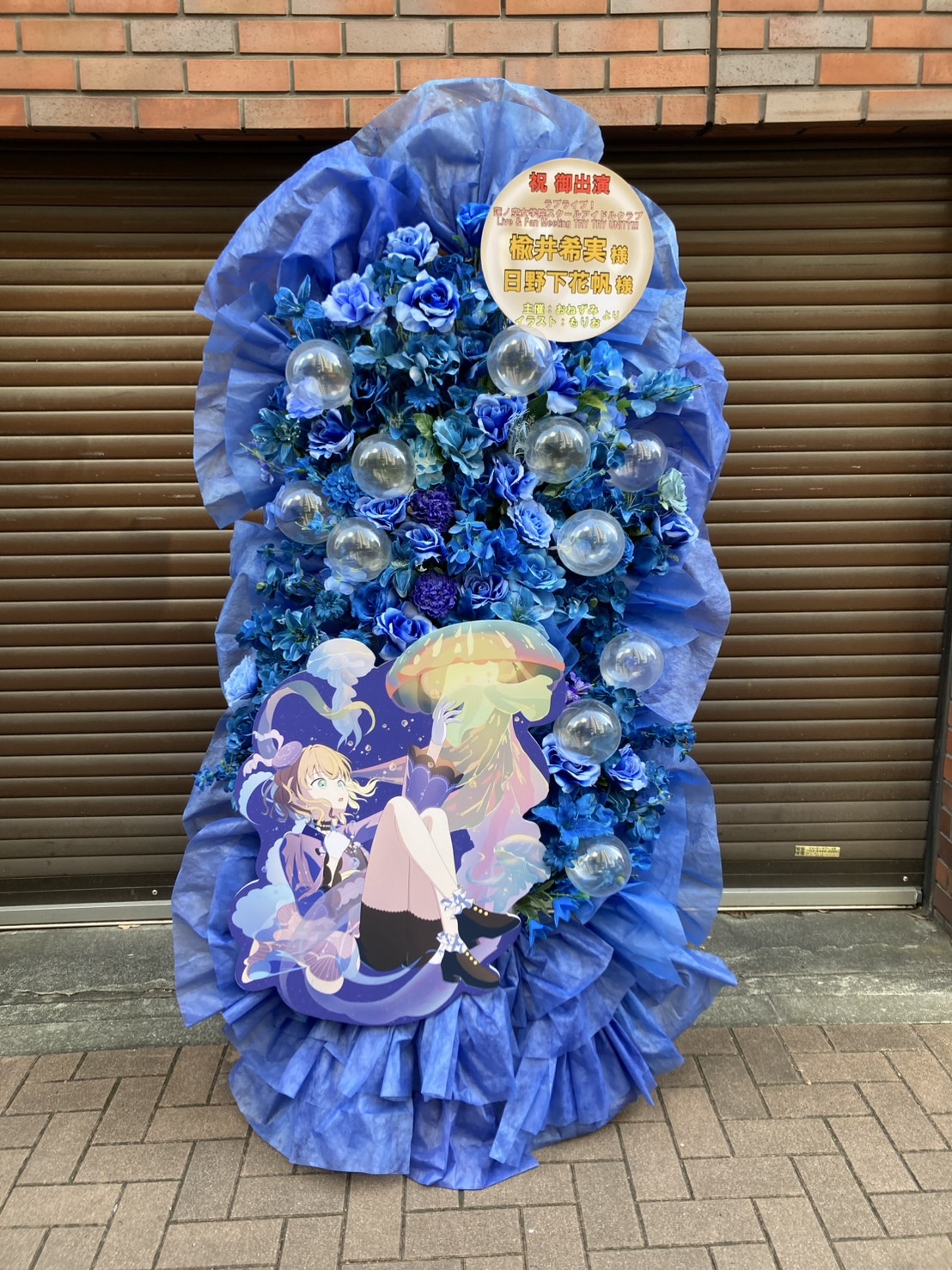 青と紫を基調とした幻想的なフラワースタンド。水中を思わせるクラゲとキャラクターパネルが美しい。