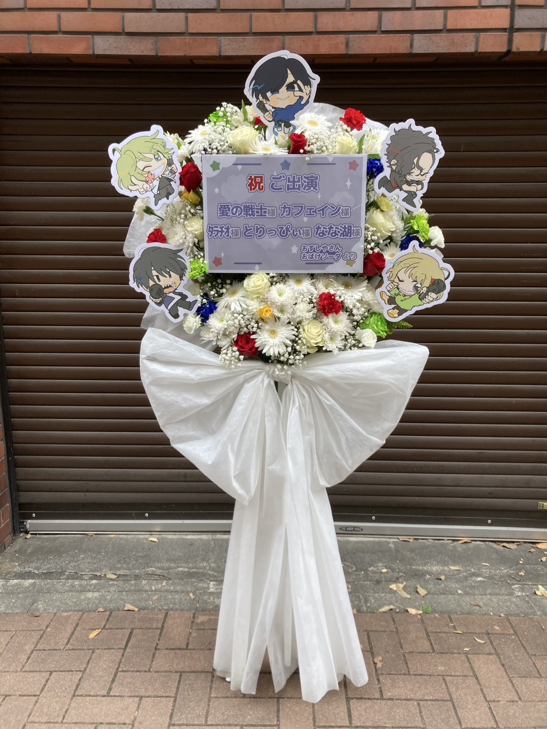 白と赤を基調に、緑が鮮やかに映える華やかな生花フラスタ。愛らしいキャラクターパネルが、お祝いムードを一層盛り上げています。