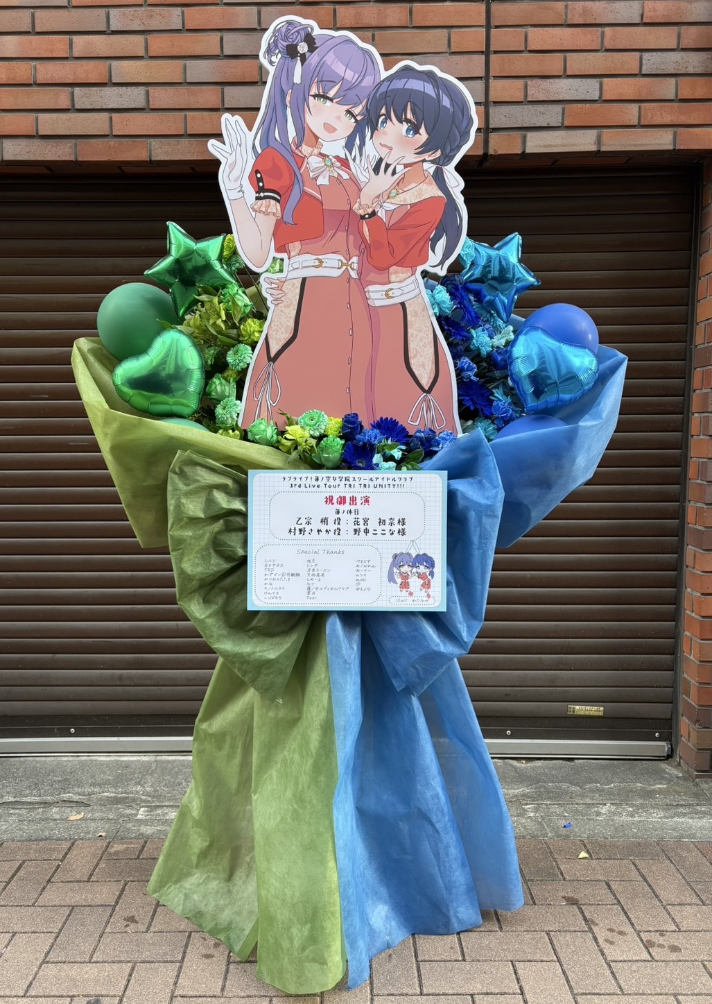 ラブライブ!蓮ノ空のフラスタ。緑と青を基調とした爽やかな色合いに、キャラクターパネルが華やかさを添える祝花です。