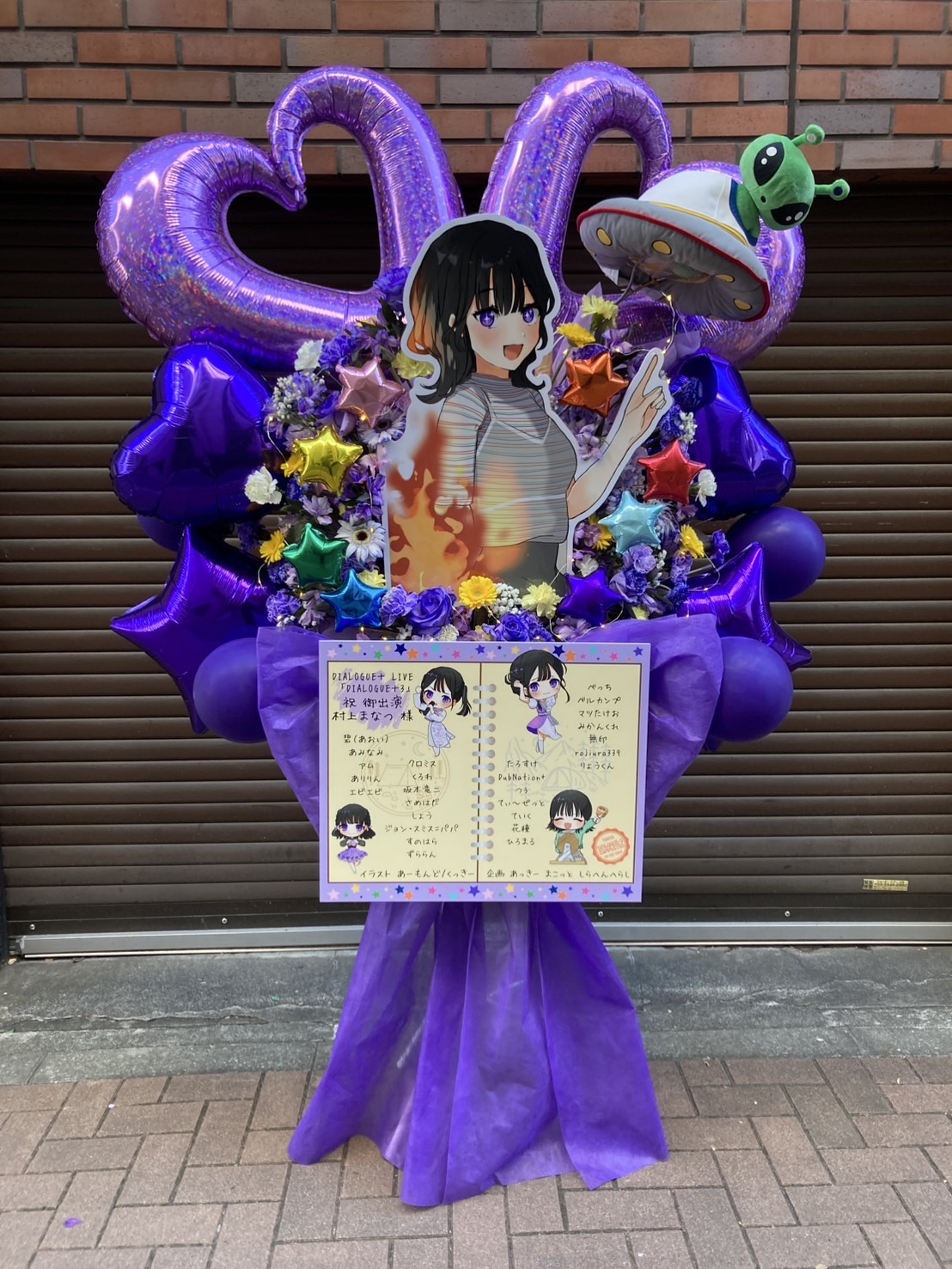 DIALOUGE+を祝う紫基調のフラスタ。カラフルなバルーンとキャラクターパネルが、華やかで可愛らしい雰囲気を演出しています。