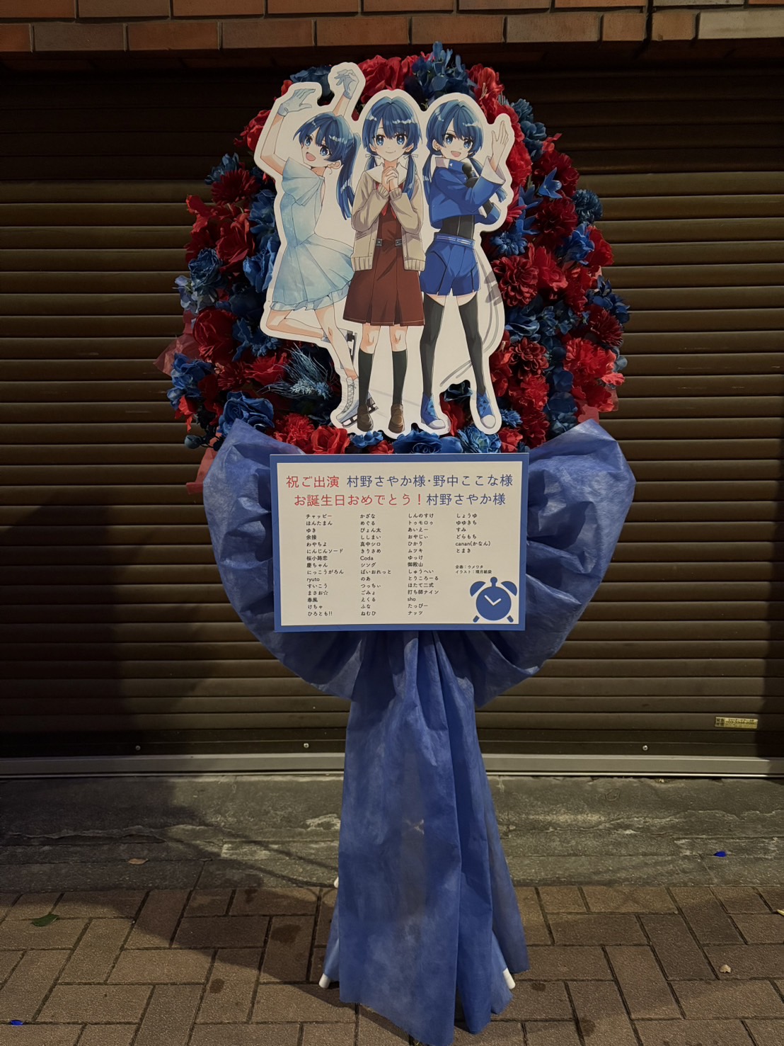 ラブライブ!蓮ノ空のライブをお祝いする赤と青のフラスタ。キャラクターパネルが目を惹き、お誕生日も兼ねた華やかで愛らしいデザインです。