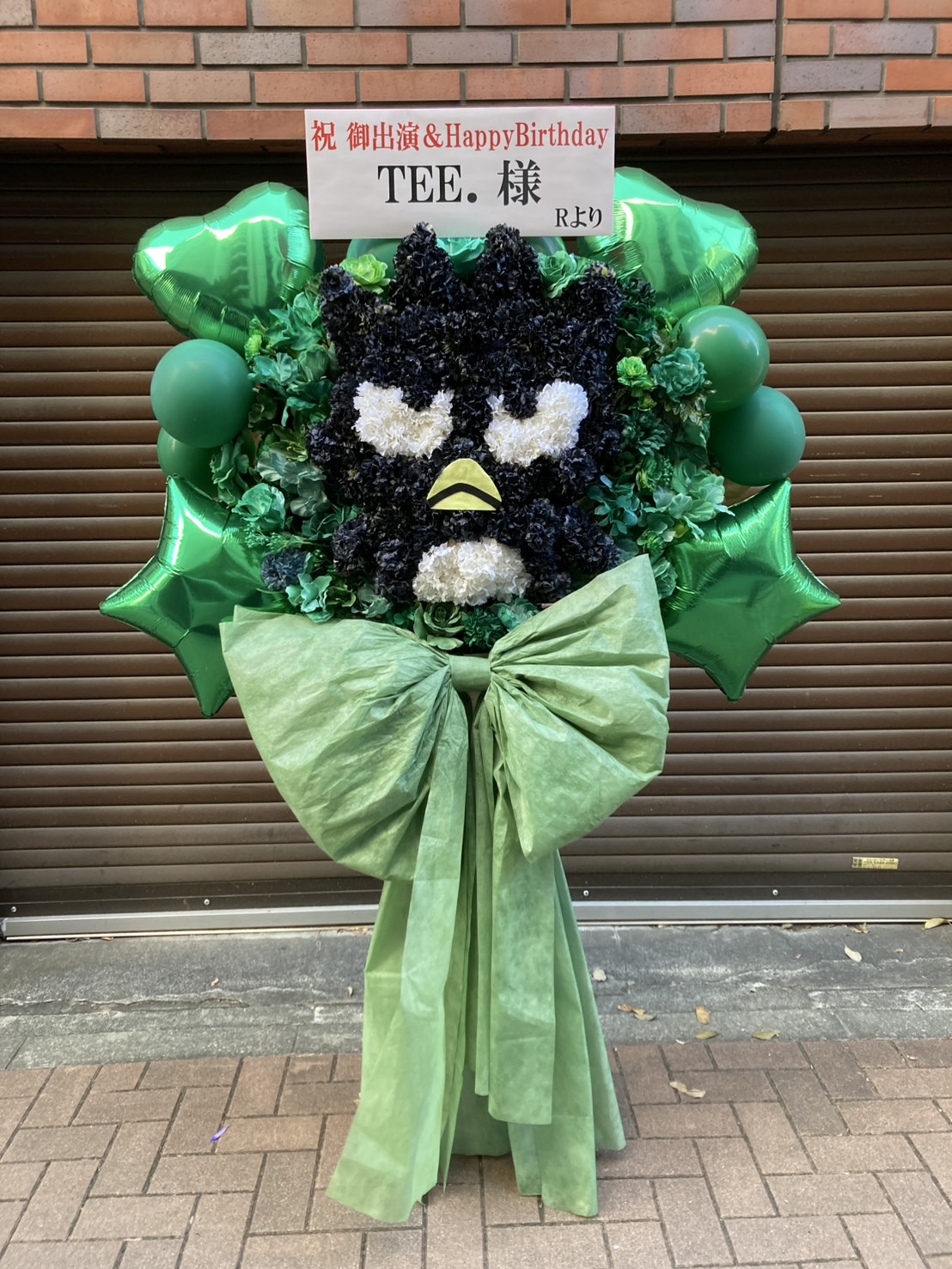 緑と黒を基調に、人気キャラクターを模したキュートなフラスタ。バルーンが華やかさを添え、お祝いムード満点です。