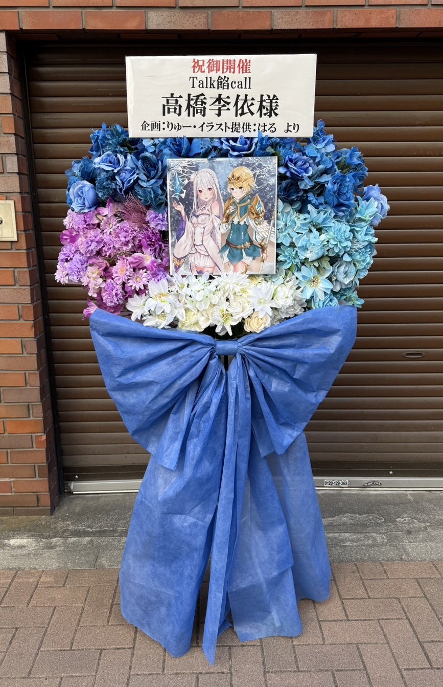 高橋李依様のライブを祝う、青・紫・白の花々が美しいフラスタ。華やかなキャラクターパネルが目を惹き、幻想的な雰囲気を醸し出しています。
