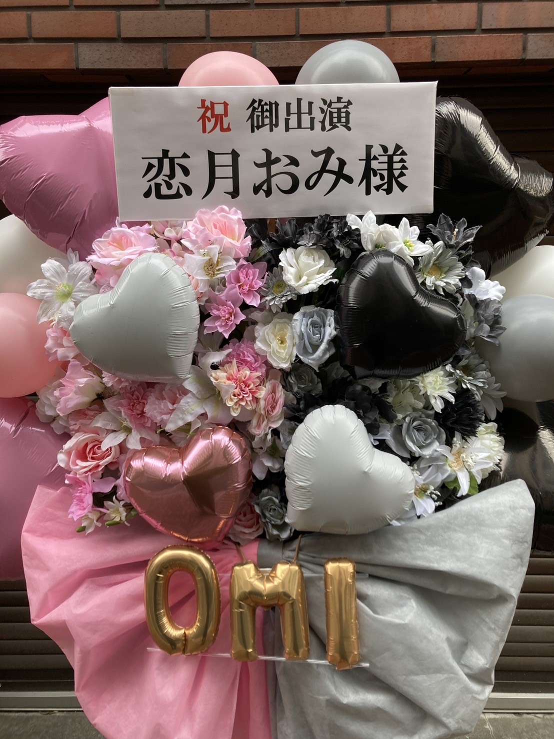 ピンクと白のバルーンと花が華やか。黒で引き締め、ゴールドの文字が輝く、恋月おみ様へのお祝いフラスタ。