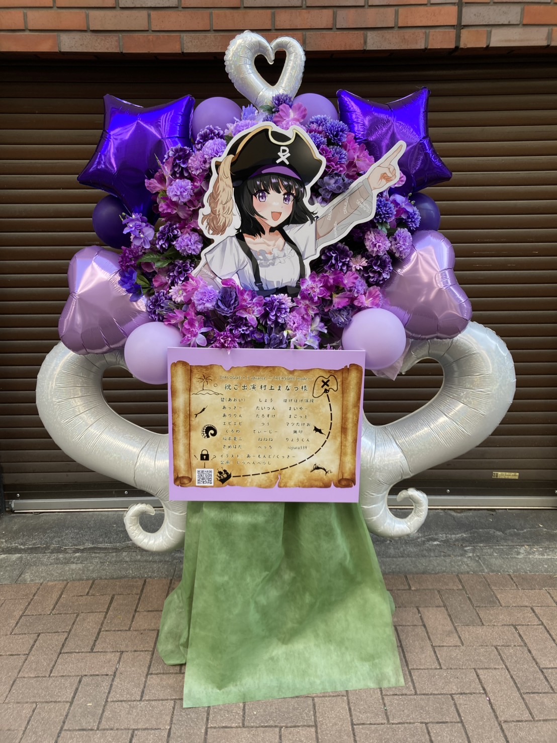紫とパステルカラーを基調とした、海賊テーマの華やかなフラスタ。バルーンと生花で表現された宝探しのようなワクワクする雰囲気です。