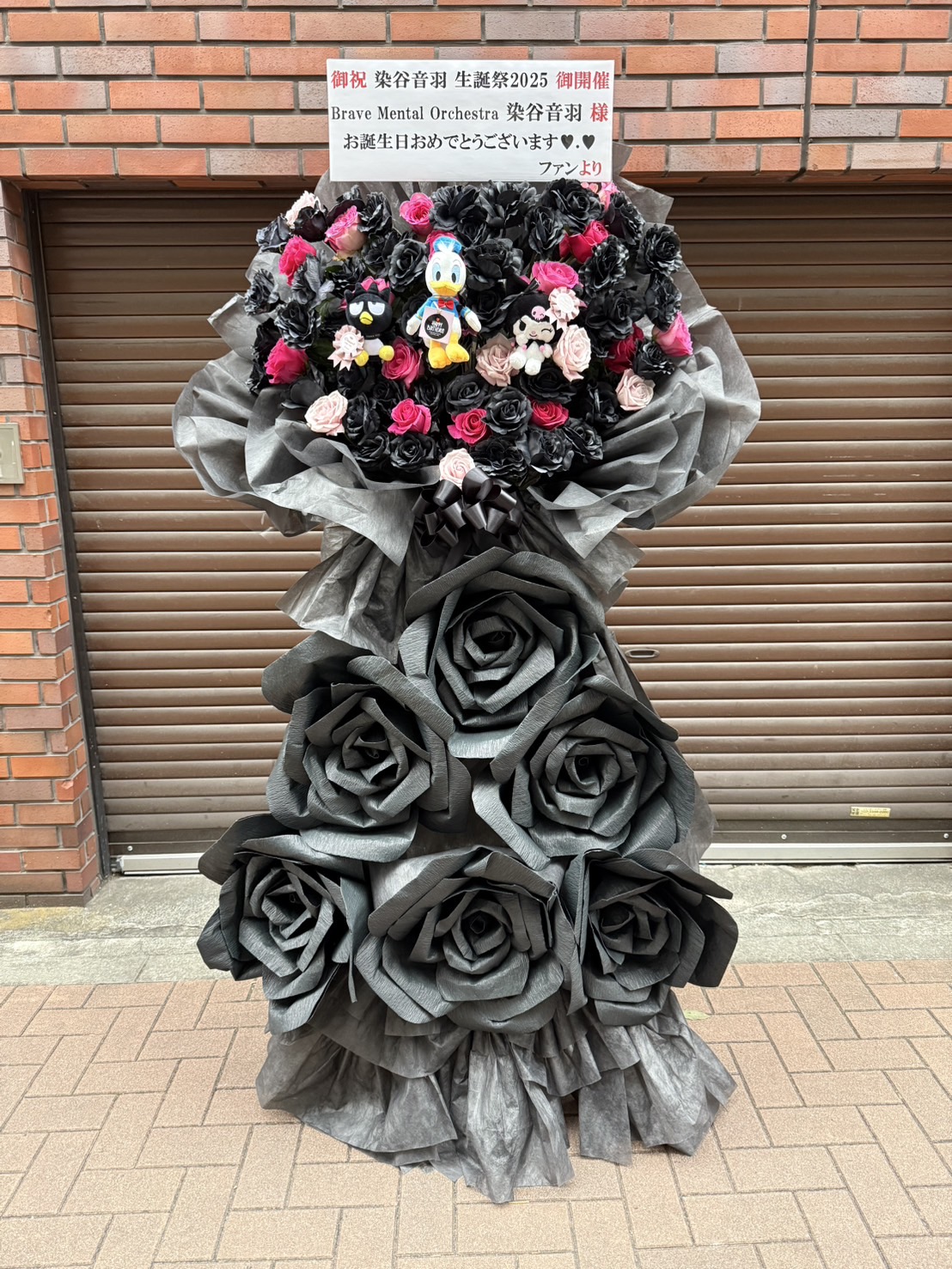 黒とピンクを基調に、クールさと可愛らしさが融合したフラスタ。キャラクターのぬいぐるみがアクセントに。