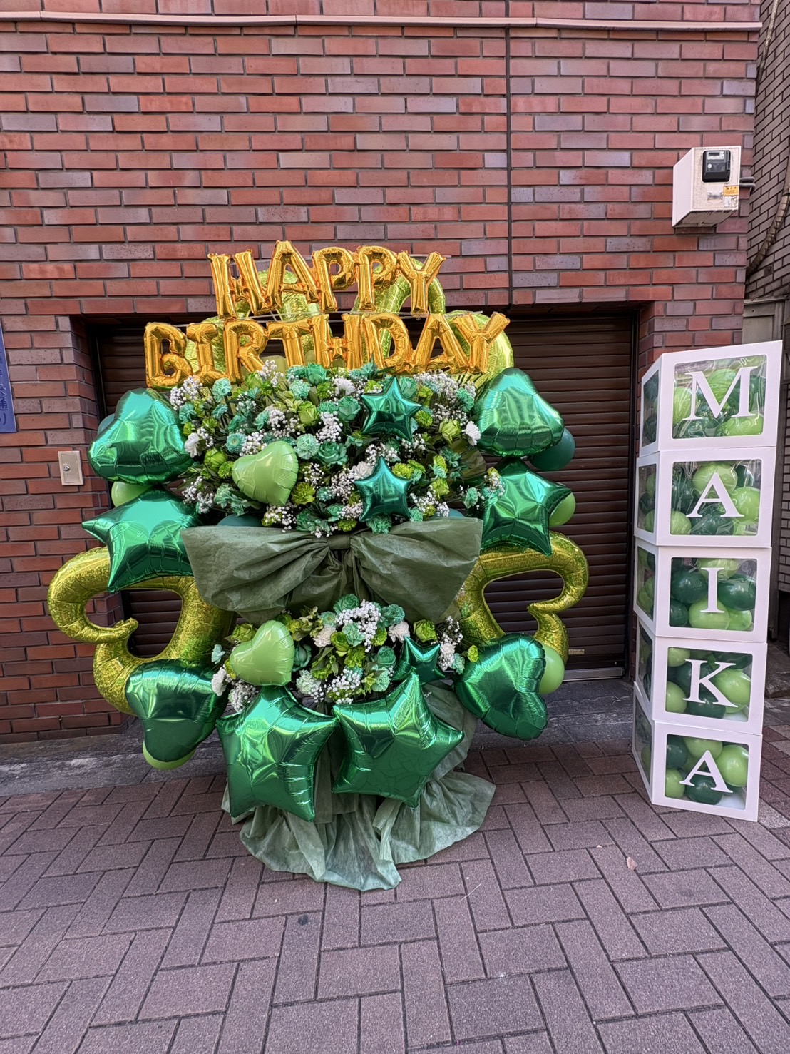 緑と黄色のバルーンと生花が華やかなバースデーフラスタ。様々なトーンのグリーンが美しく、ポップな中にもナチュラルな雰囲気を感じさせます。