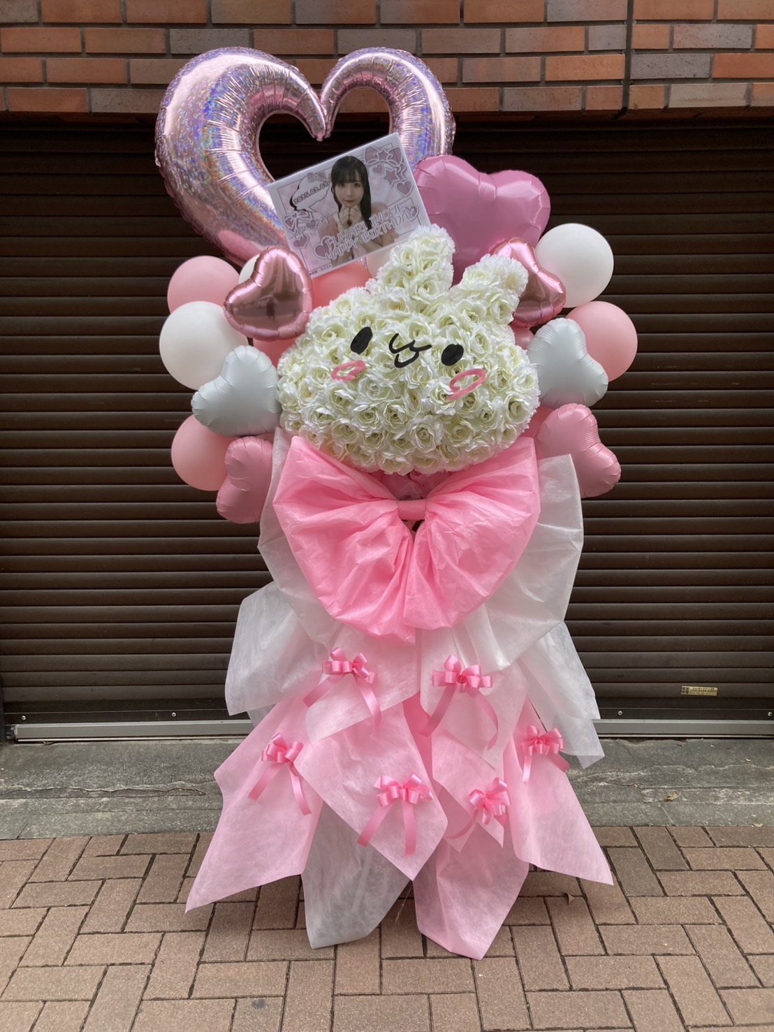 ピンクと白を基調とした、可愛らしいウサギモチーフのフラワースタンド。バルーンと生花が華やかにお祝いムードを演出します。