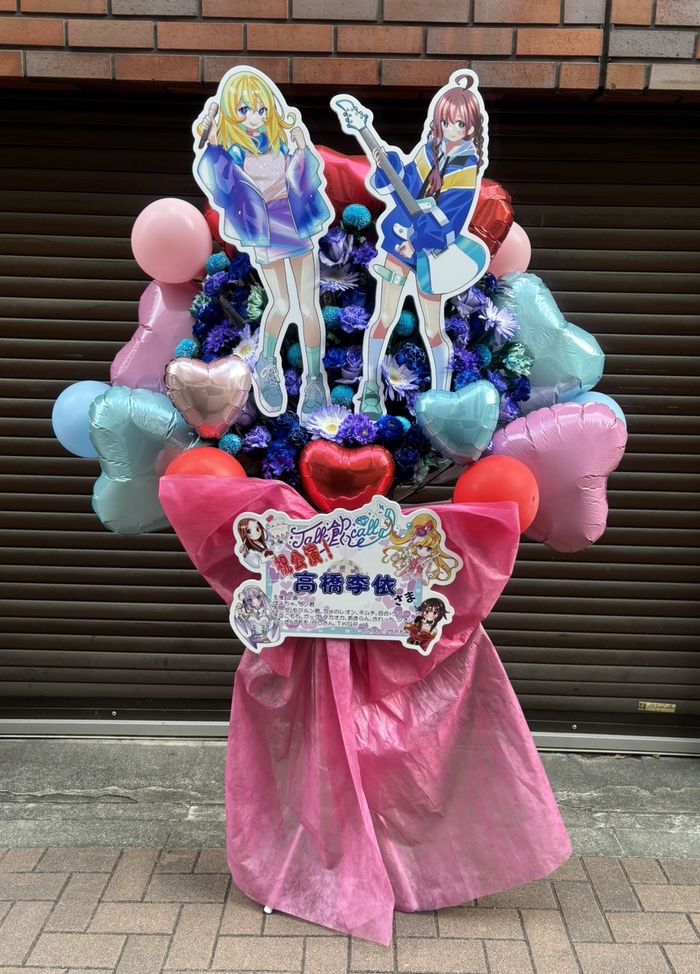 高橋李依さんのキャラクターソングライブを祝う、ピンクと青紫が鮮やかなフラスタ。バルーンとパネルで可愛く華やかな雰囲気に。
