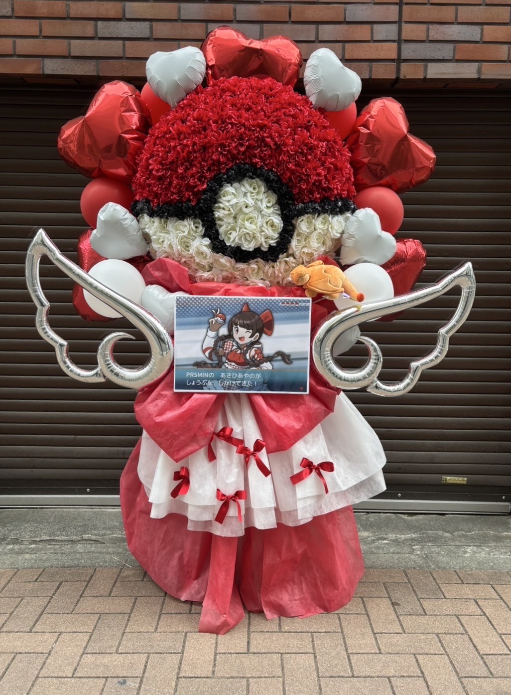 赤と白を基調とした、ポケボールモチーフが目を引く華やかなフラスタ。バルーンと生花で彩られ、朝陽あやのさんの生誕祭をお祝いしています。