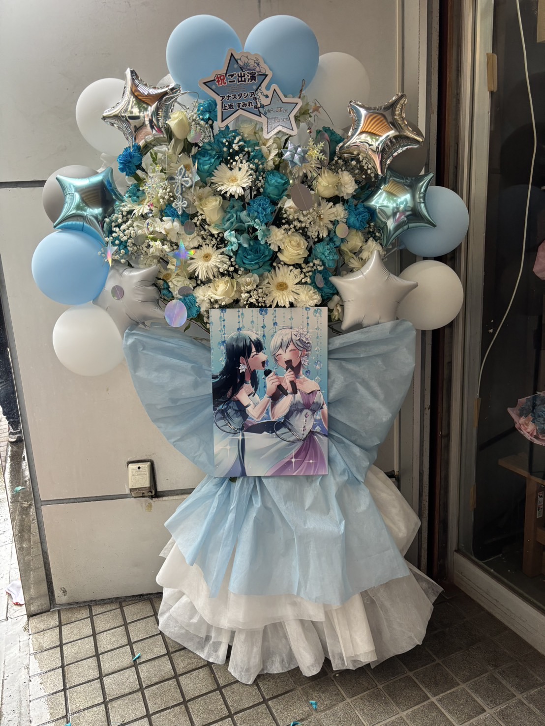 パステルブルーと白で爽やかに彩られたフラスタ。生花とパネルが華やかで上品な雰囲気を演出しています。