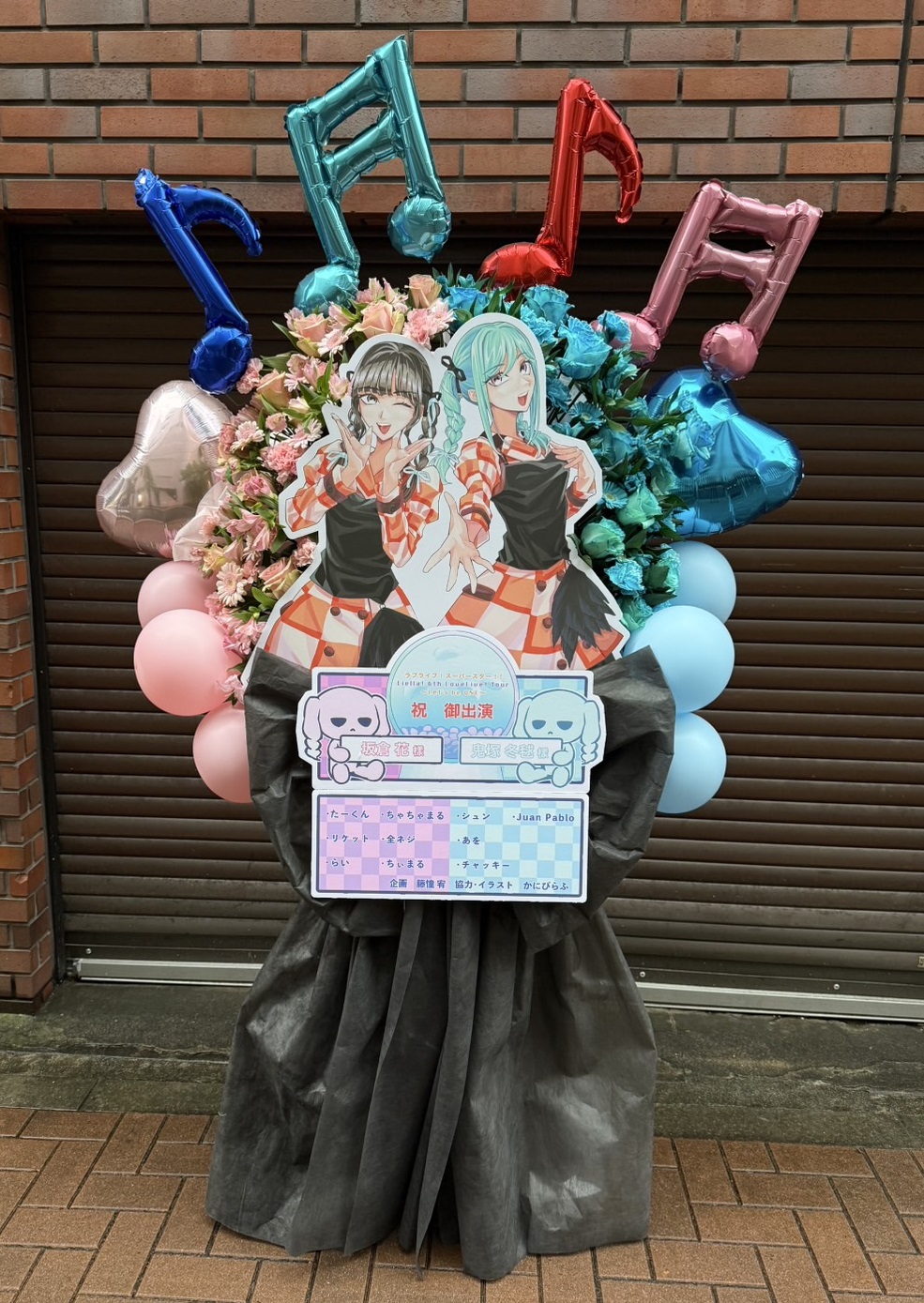 ラブライブ!Liella!を祝う、ピンクと水色の生花とカラフルバルーンが華やかなフラスタ。音楽イベントにぴったりの賑やかなデザインです。