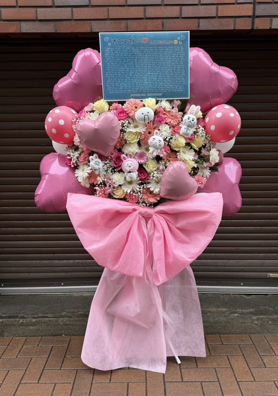 ピンクとパステルカラーで春の訪れを表現した華やかなフラスタ。たくさんのハートバルーンとうさぎの飾りが可愛らしく、会場を明るく彩ります。