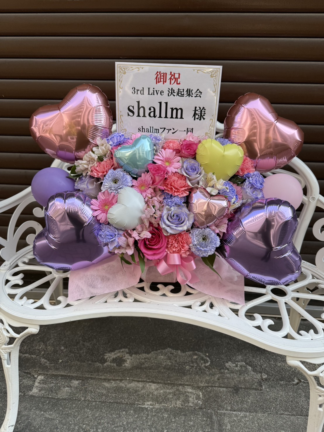 パステルカラーの生花と、ピンク・紫のハートバルーンが可愛いフラスタ。ライブ決起集会にふさわしい、明るく華やかな応援の気持ちが伝わります。