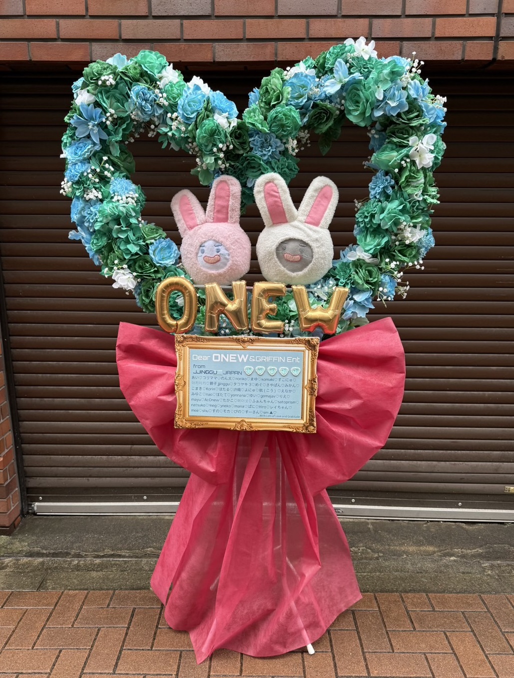 青と緑のハート型リースが目を引く、春らしい爽やかなフラスタ。ピンクのうさぎが可愛らしさを添え、温かいエールを送ります。