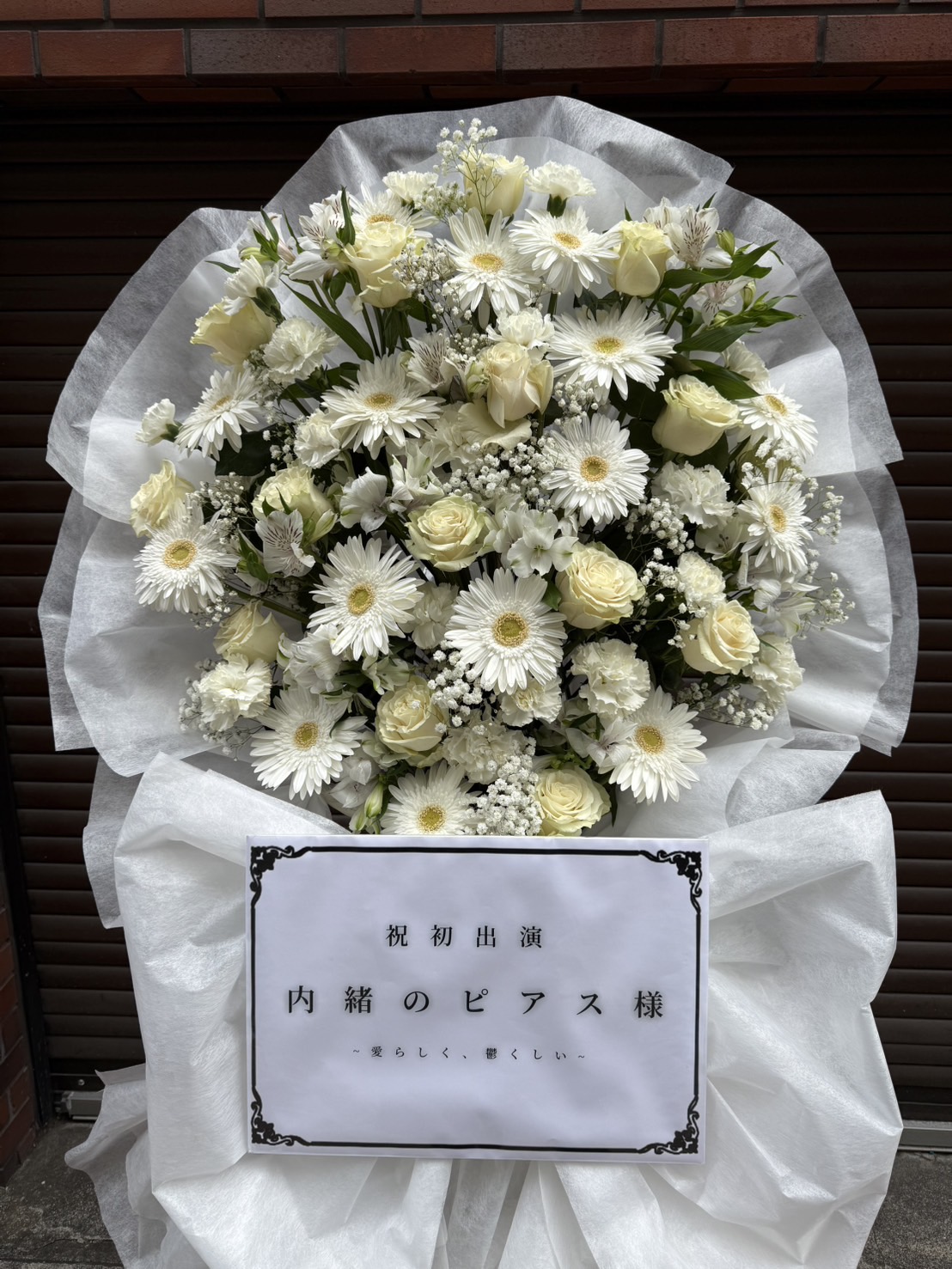 白を基調とした、清潔感あふれるフラワースタンド。純粋な白バラとガーベラが、初出演を華やかに彩ります。