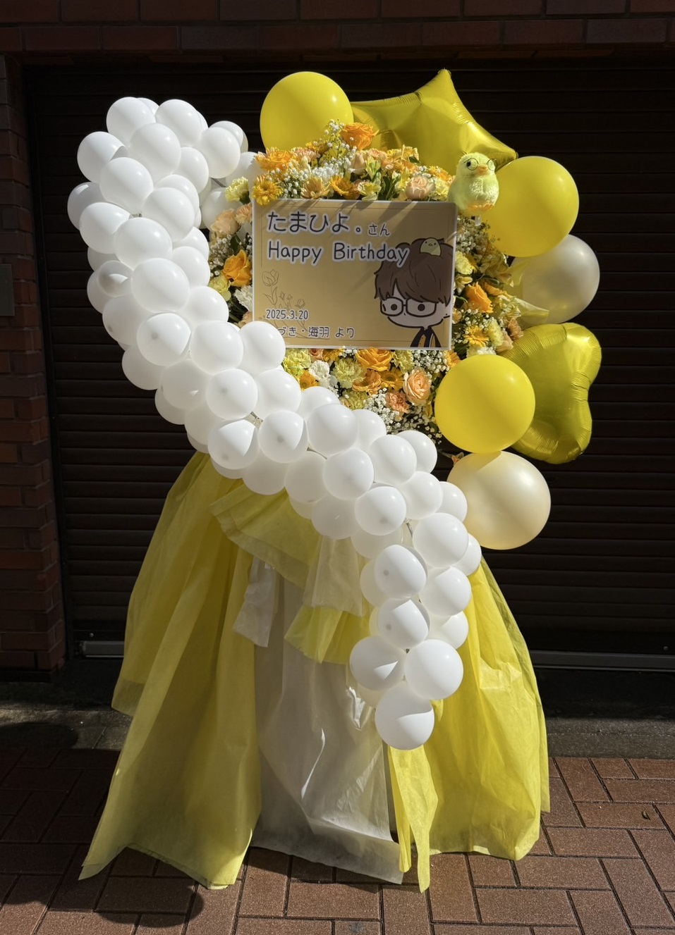 たまひよ。さんの生誕祭を彩る、明るいイエローとホワイトが基調のバルーン&生花フラスタ。キュートなキャラクターパネルが目を引きます。
