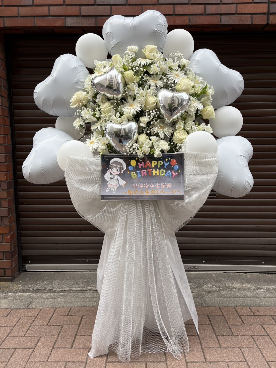 白い生花とバルーンで統一された、上品で清楚なフラスタ。シルバーのハートがアクセントとなり、里仲凌空さんの生誕祭を華やかに彩ります。