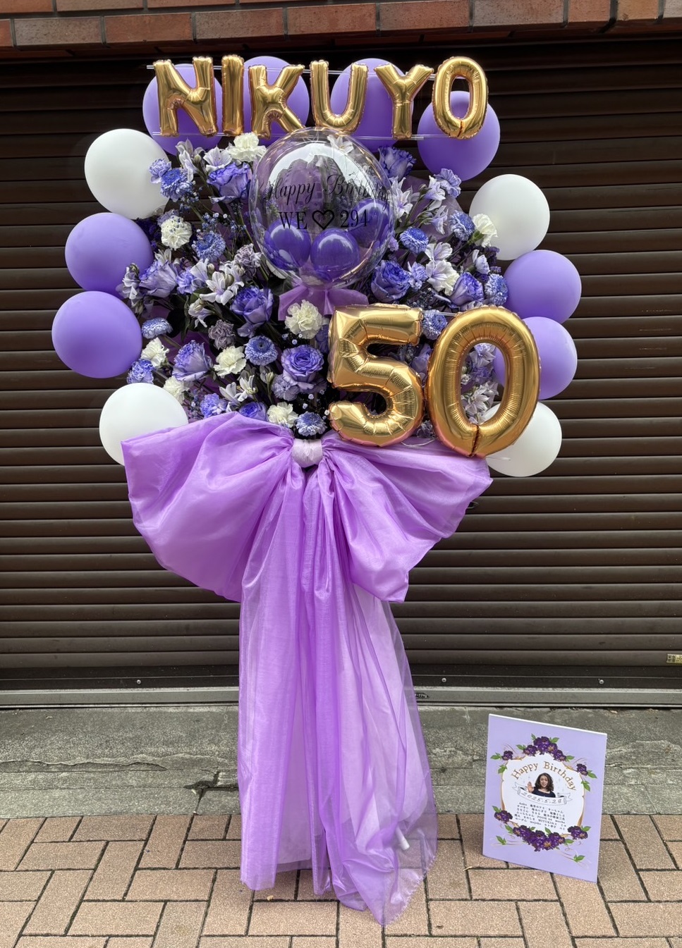 上品な紫と白の生花に、金色のバルーンが映える華やかなフラスタ。心温まる誕生日のお祝いにぴったりです。