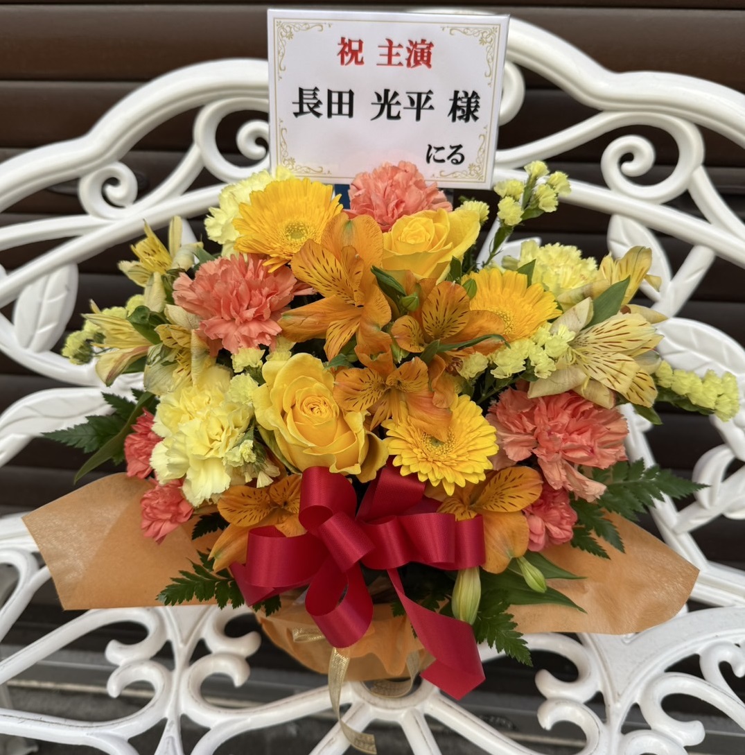 黄色とオレンジの生花が鮮やかなアレンジメント。赤色のリボンがアクセントになった華やかな雰囲気です。