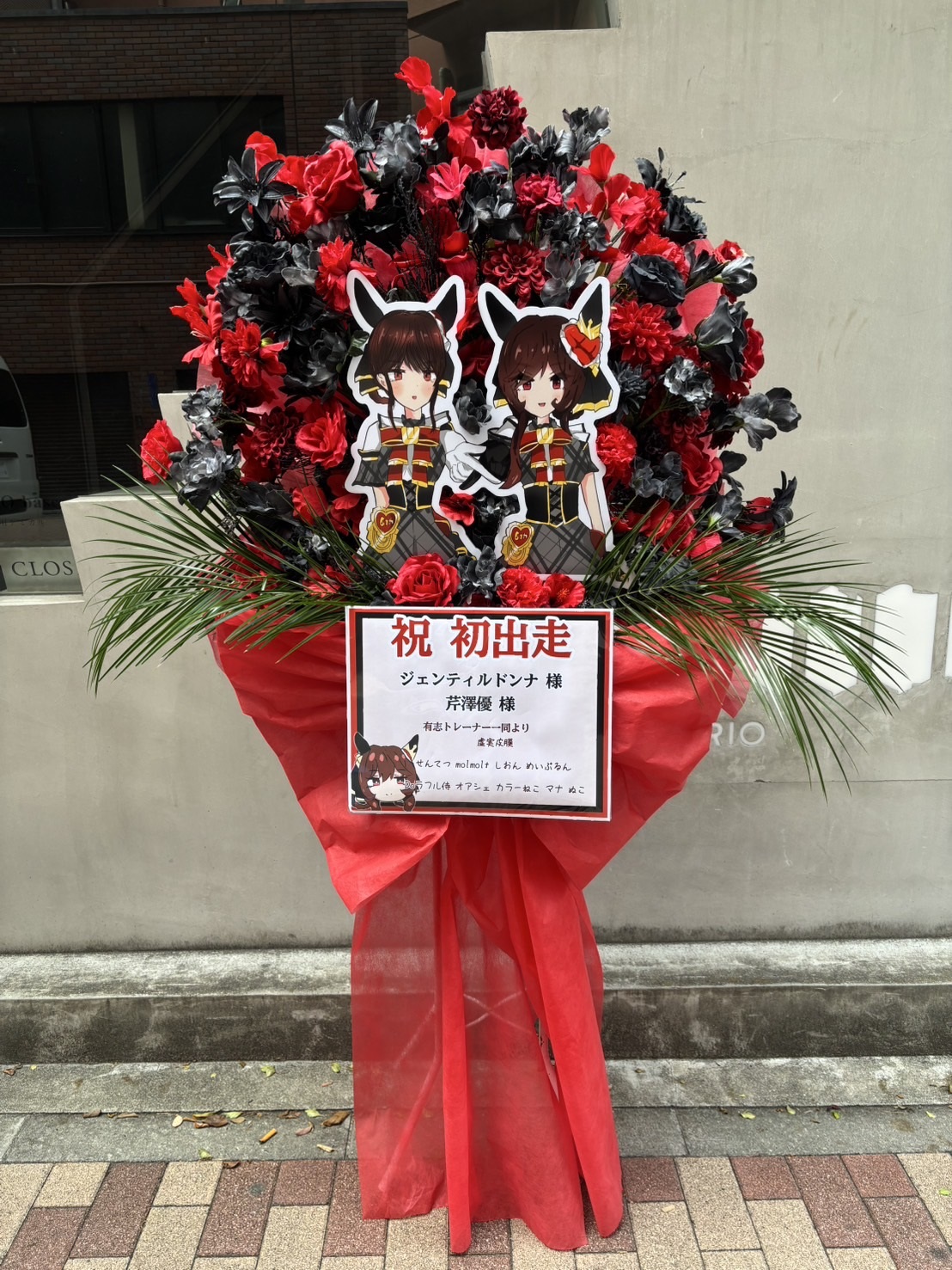 ウマ娘のイメージにぴったりの、赤と黒で構成されたゴージャスなフラスタ。キャラクターパネルが華やかさを添え、力強い雰囲気を演出しています。
