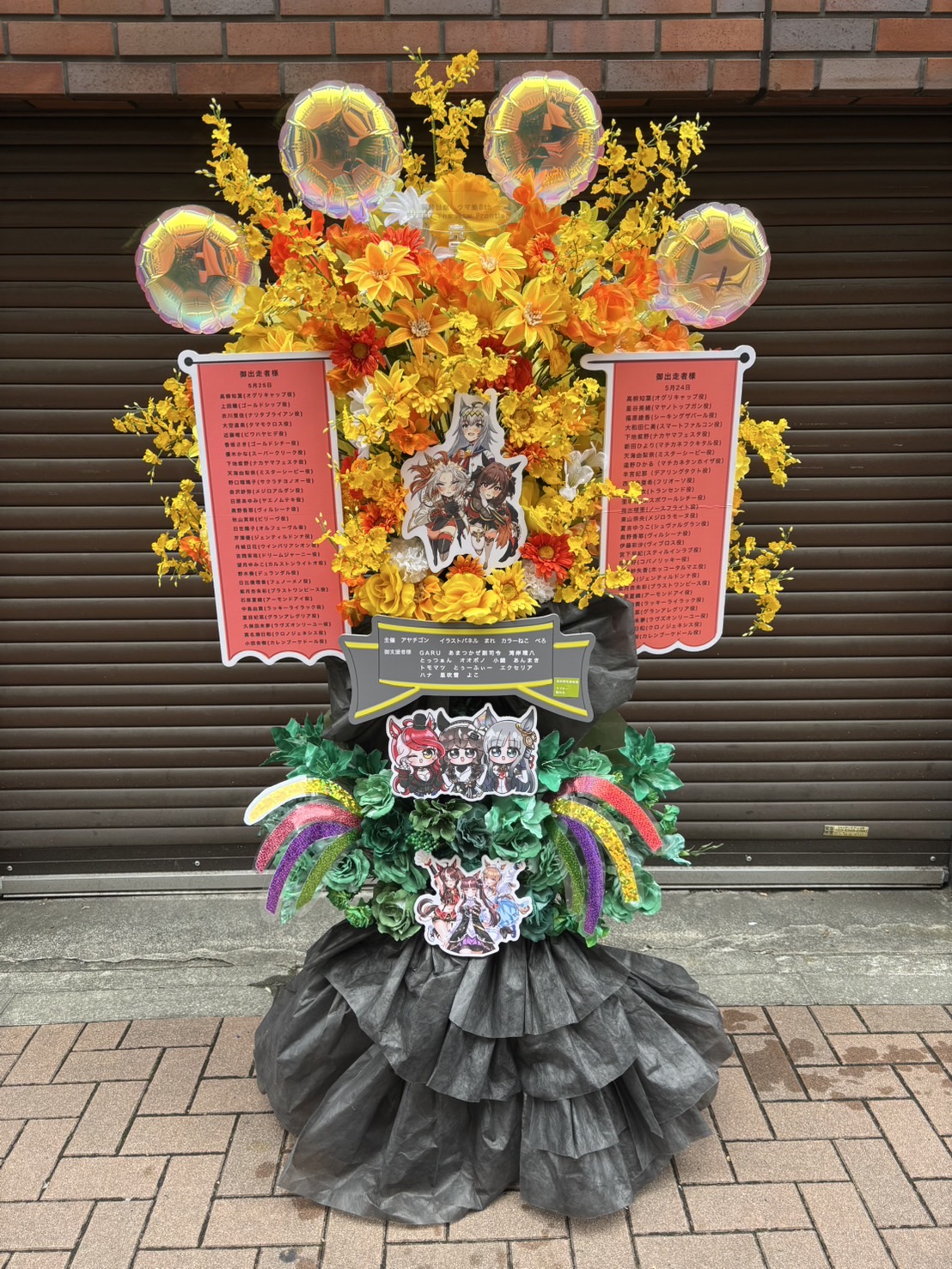 ウマ娘6thイベントを彩る、黄と緑が鮮やかなフラスタ。バルーンやキャラパネルで賑やかさを演出。