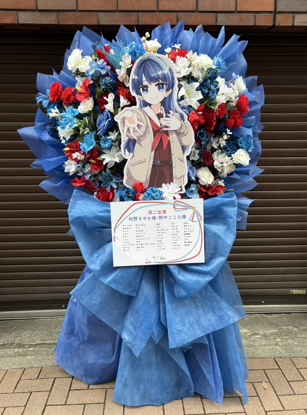 青を基調に赤と白の鮮やかなフラスタ。キャラクターパネルが目を引き、華やかで元気いっぱいの応援が伝わります。