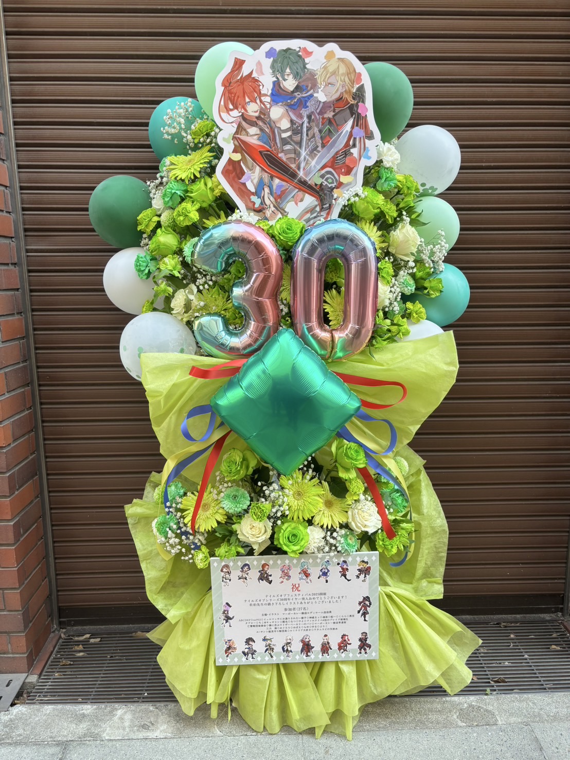 テイルズオブフェスティバルを彩る豪華なフラスタ。緑と白の生花を基調に、キャラクターパネルとバルーンで盛大にお祝いの気持ちを表現しています。