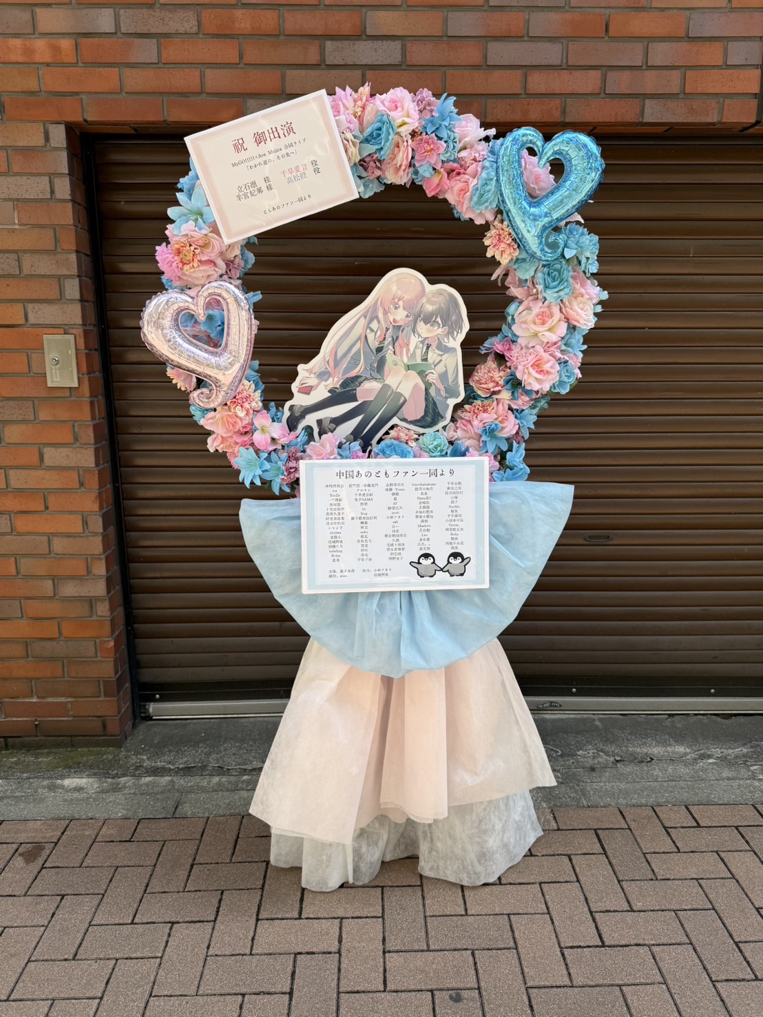 MyGO!!!!!×Ave Mujicaライブへ。パステルピンクとブルーの花々とバルーンが可愛らしいフラスタ。中央のキャラクターパネルがイベントの雰囲気を華やかに彩ります。