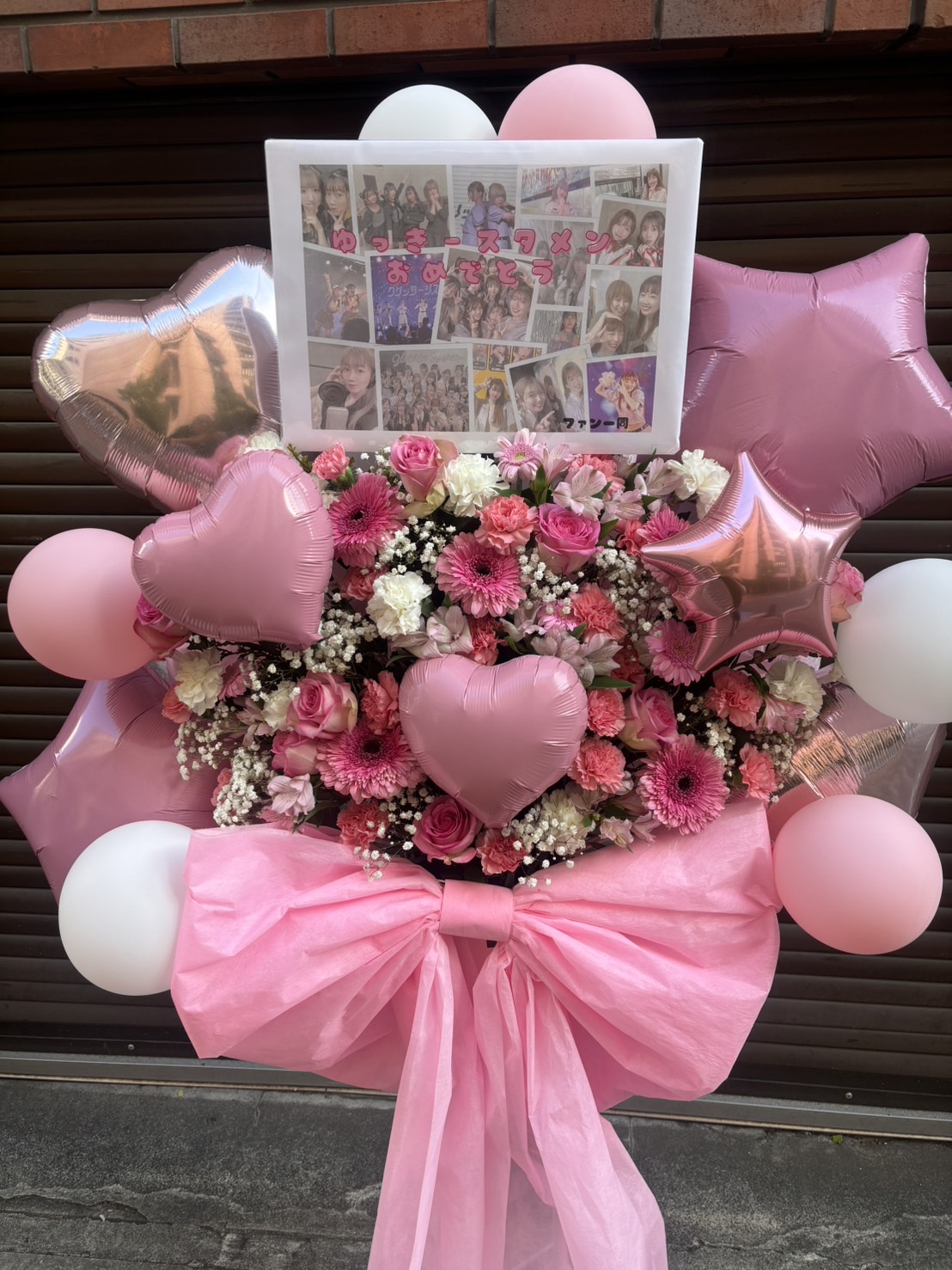 ピンクと白の生花とバルーンをふんだんに使用した、可愛らしく華やかなフラスタ。写真パネルでお祝いムード満点です。