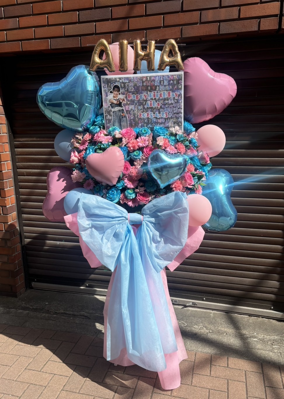 ピンクと水色のパステルカラーが可愛らしいフラスタ。バルーンと生花で彩られ、お祝いムード満点です。