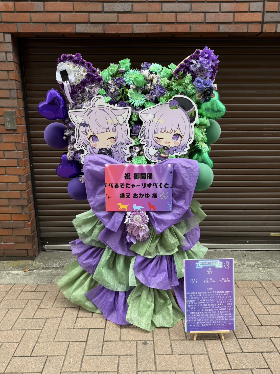 猫又おかゆさんの2nd Liveを祝うフラスタ。紫とパステルグリーンの花々で猫耳を表現し、バルーンやパネルで可愛らしい世界観を演出。
