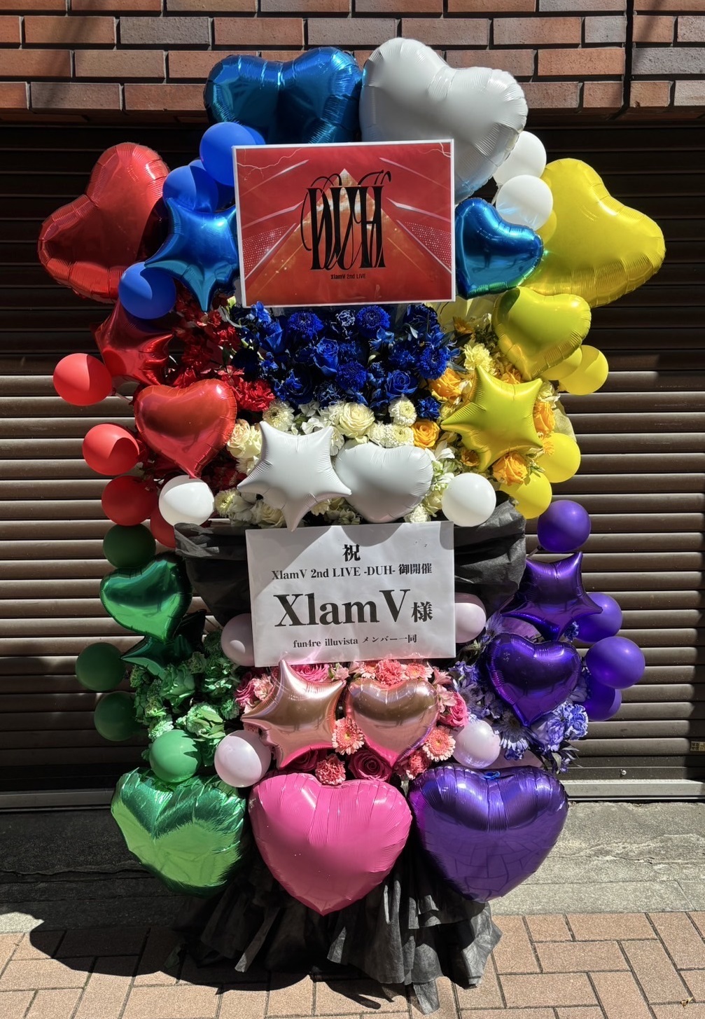 XlamV 2nd LIVEを祝う、虹色のバルーンと鮮やかな生花が織りなす豪華なフラスタ。祝祭感あふれる華やかなデザインです。