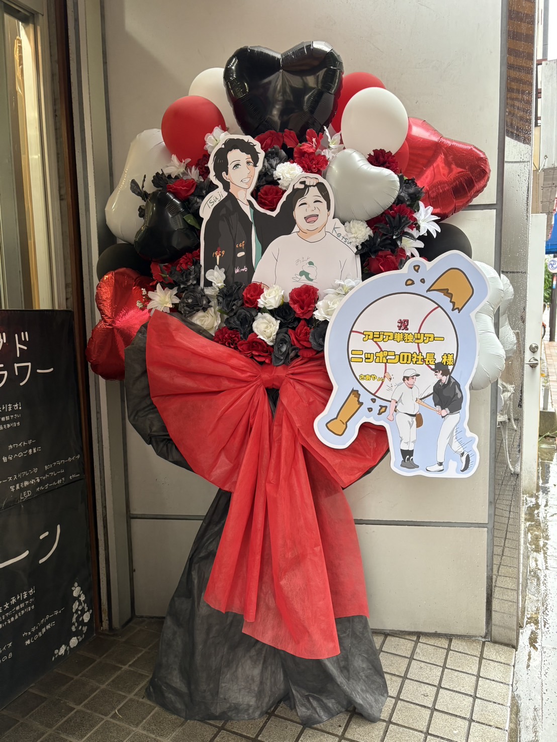 ニッポンの社長さんのアジア単独ツアーをお祝いする、赤・黒・白で統一された華やかなフラスタです。バルーンとキャラクターパネルがポップで楽しい雰囲気を演出しています。