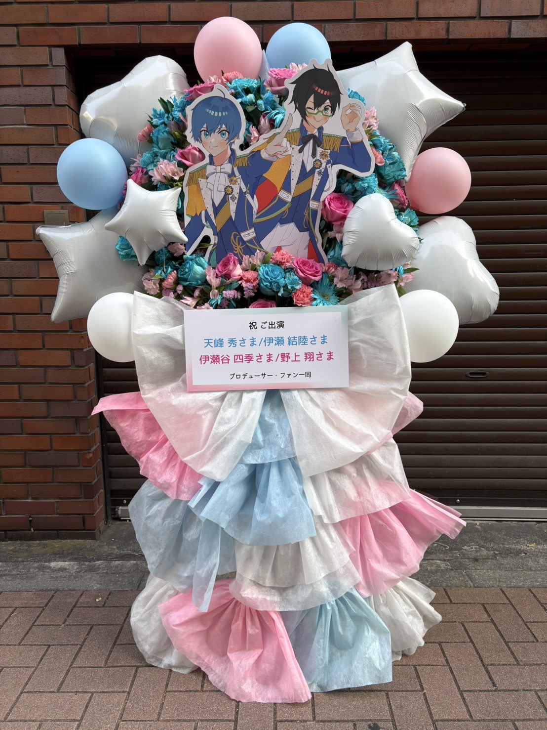 SideM10周年を祝うパステルカラーのフラスタ!ピンクと水色のバルーンと生花が華やかで、キャラクターパネルが可愛らしい雰囲気を演出。