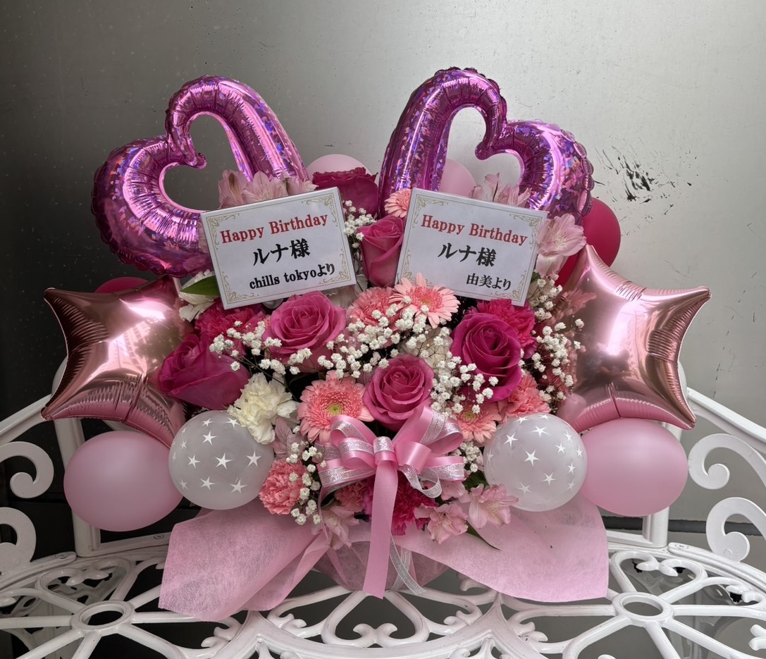 ピンクと白の花々に、ハートや星のバルーンが華やか。ルナ様バースデーをお祝いする可愛らしいフラスタです。