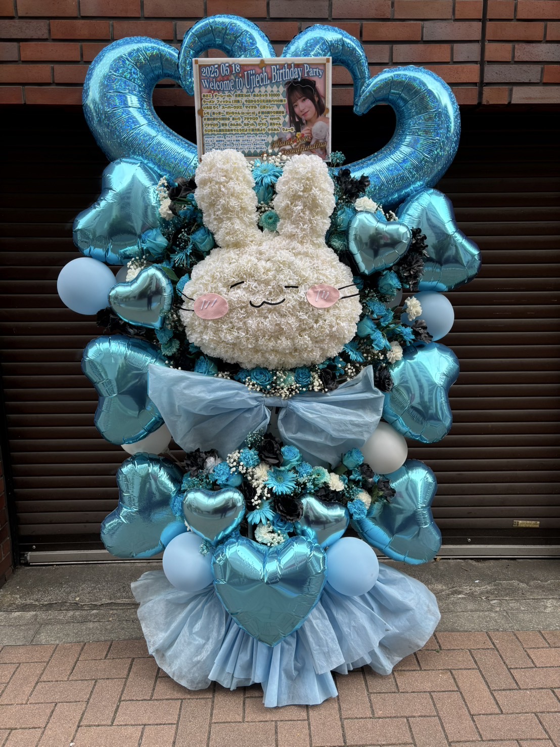 水色と白を基調とした、うさぎのぬいぐるみが可愛いフラスタ。お祝いムードあふれる、夢のようなデザインです。