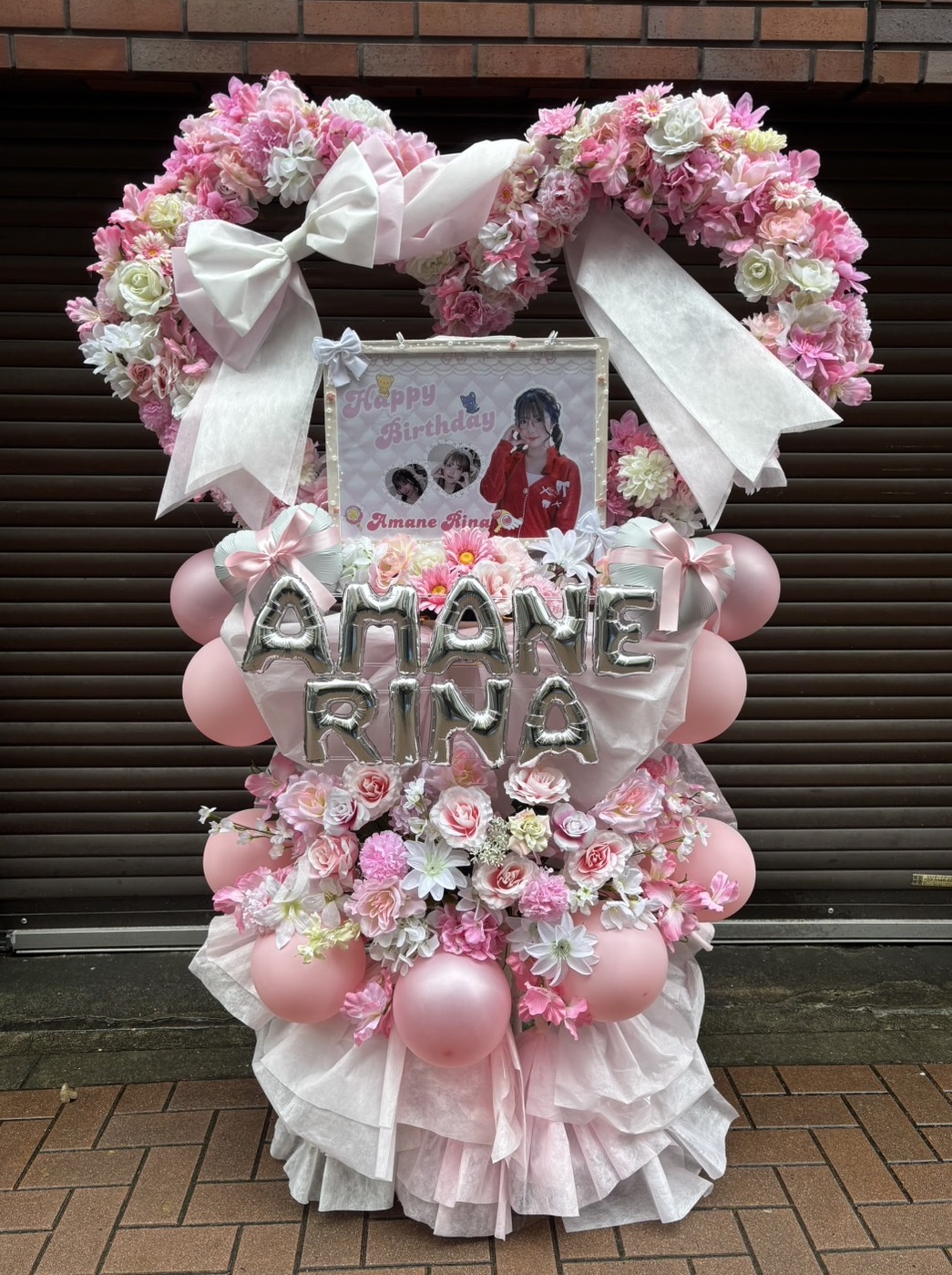 ピンクと白のグラデーションが美しいフラスタ。ハート型の花飾りとバルーンで、可愛らしく華やかな生誕祭を演出します。