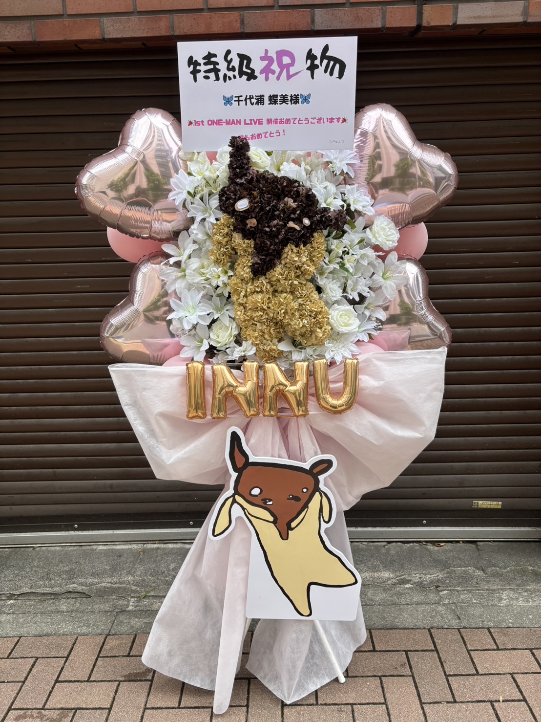 ピンクと白の柔らかな色合いに、ゴールドのバルーンが華やかさを添えるフラスタ。可愛らしいキャラクターがお祝いムード満点です。