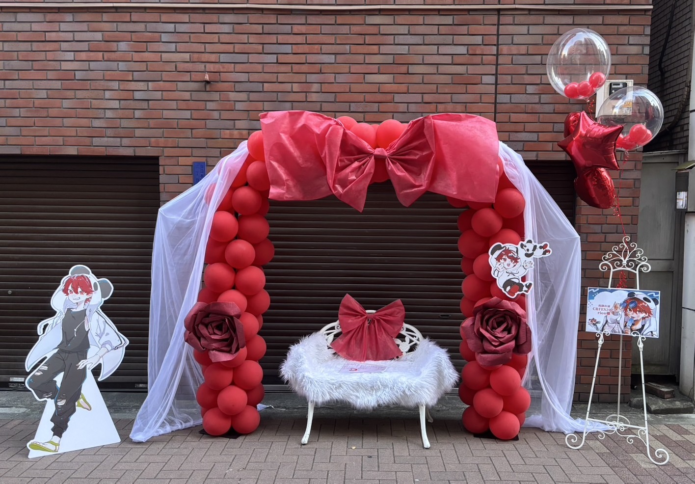 赤と白が織りなす華やかなバルーンアーチのフラスタ。キュートなキャラクターパネルとふわふわのベンチが、お祝いムードを盛り上げます。
