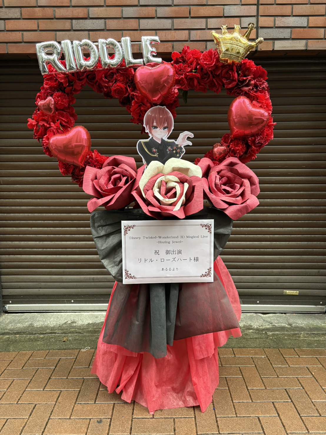 「ツイステ」のリドル・ローズハート様へ贈られた、赤と黒を基調とした情熱的なフラスタ。ハート型の装飾とキャラクターパネルが目を引きます。