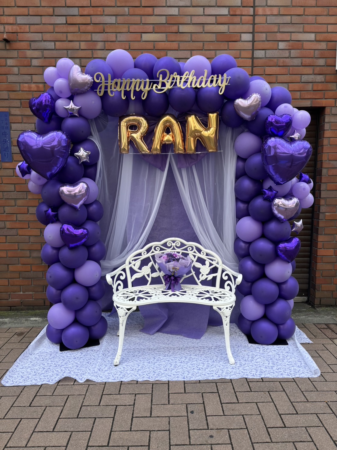 紫色のバルーンアーチが華やかな生誕祭フラスタ。白のベンチが上品さを添える。