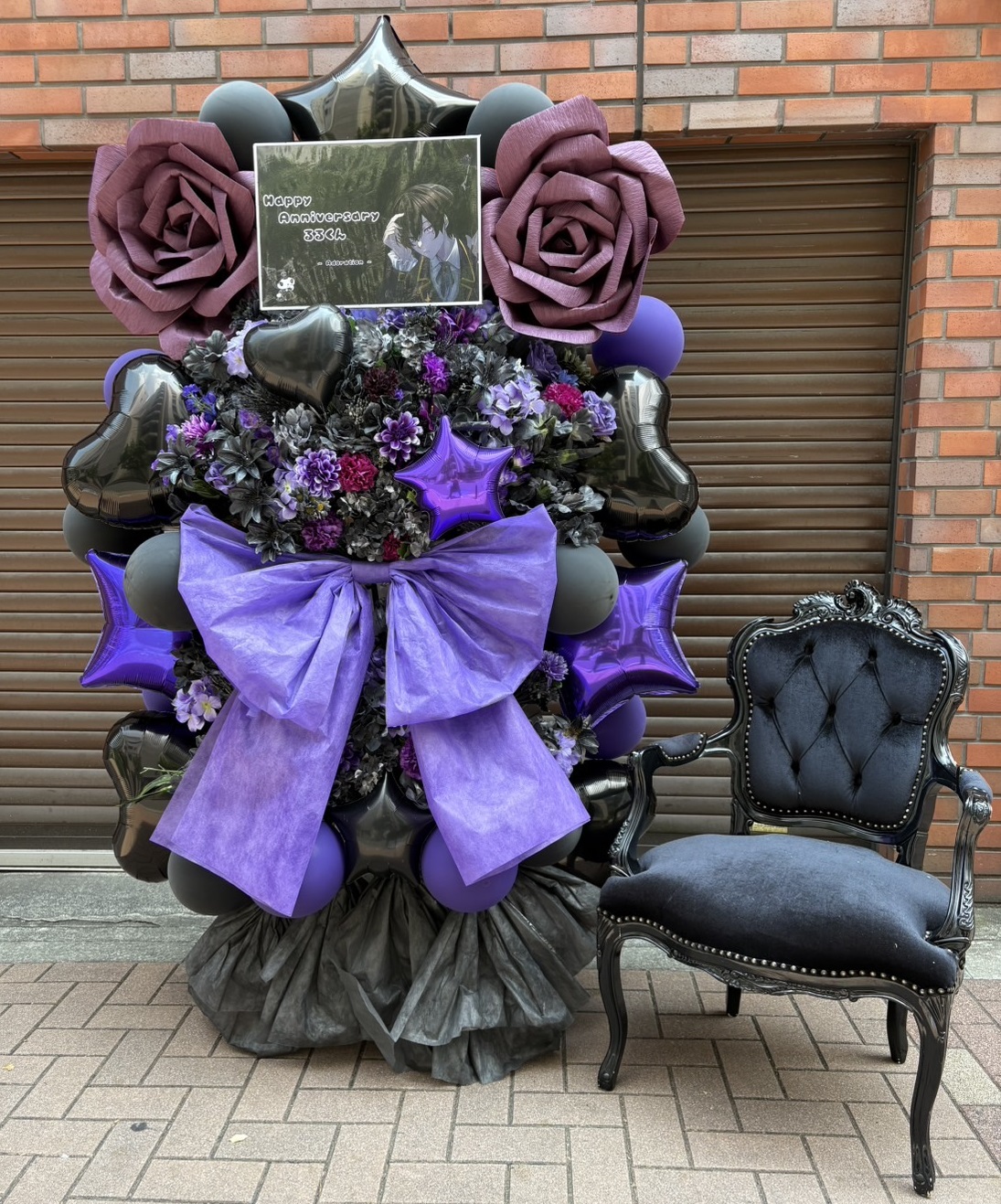 紫と黒を基調としたゴシックでミステリアスなフラスタ。大きなリボンとバラが華やかさを添え、キャラクターを祝うエレガントなデザインです。
