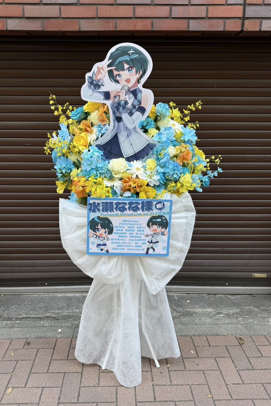 水瀬なな様ご出演のバーチャルライブをお祝いするフラスタ。青と黄色の生花が爽やかで元気な雰囲気を演出しています。