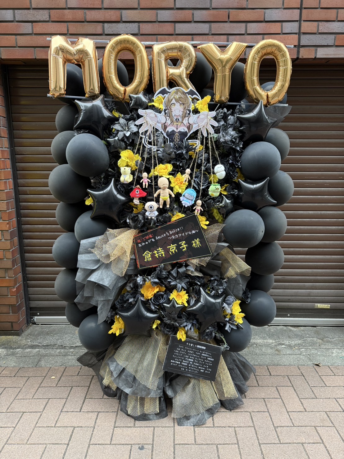 黒と黄色のコントラストが鮮やかなバルーンフラスタ。キャラクターパネルと吊り下げられた人形が遊び心を演出。華やかな舞台を彩ります。