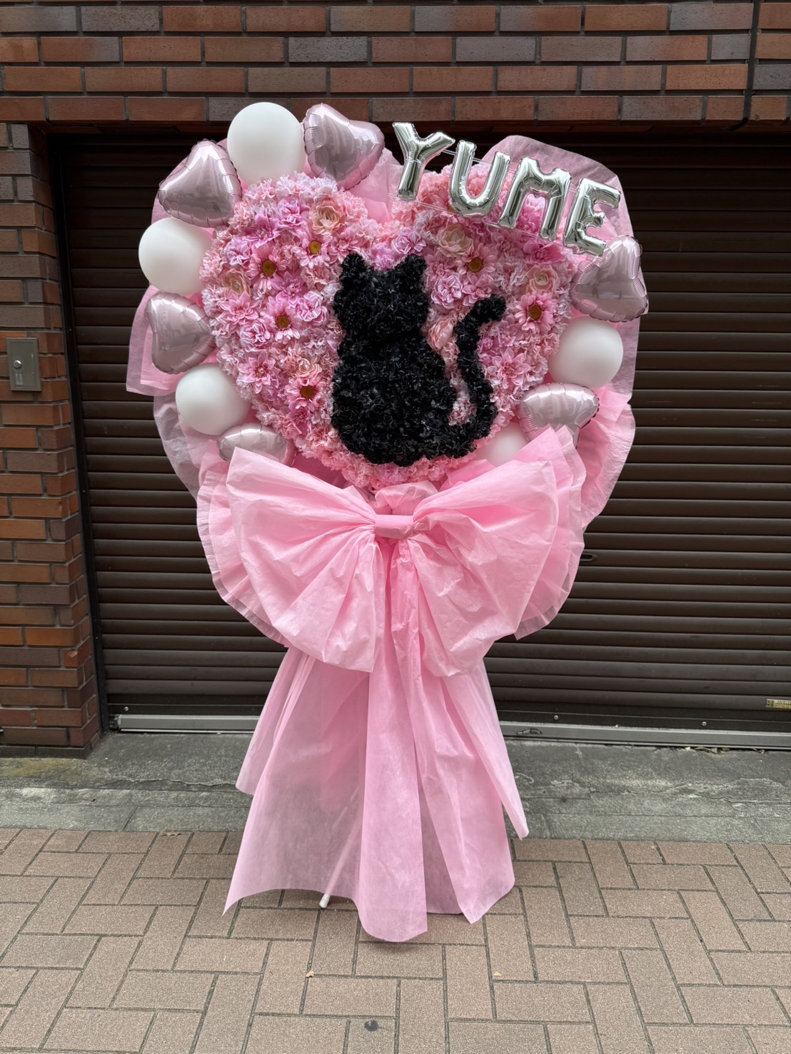 ピンクの花で彩られたハート型スタンドに黒猫モチーフが可愛い!バルーンと「YUME」の文字で華やかさもプラスした生誕祭フラスタです。
