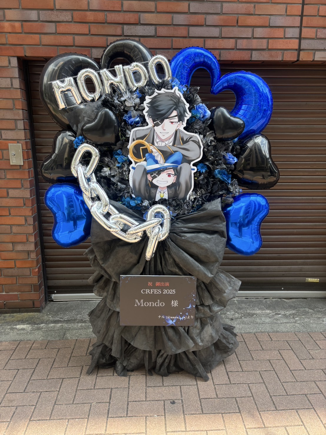 CRフェス2025を祝う、青と黒がクールなフラスタ。キャラクターパネルとバルーンが華やかさを演出しています。